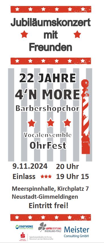 Es geschah vor 22 Jahren. Eine Gruppe singfreudiger Menschen kämpfte sich durch widriges Winterwetter in die Westpfalz, um dort an einem Gesangsworkshop zum Barbershopstil teilzunehmen. Davon waren sie so begeistert, dass sie nach dem Workshop einen Chor gründeten. Sie nannten sich Four (ursprünglich wurde Barbershop von Quartetten gesungen) and More (denn sie waren mehr als vier). Außerdem waren sie der erste gemischte Barbershopchor
